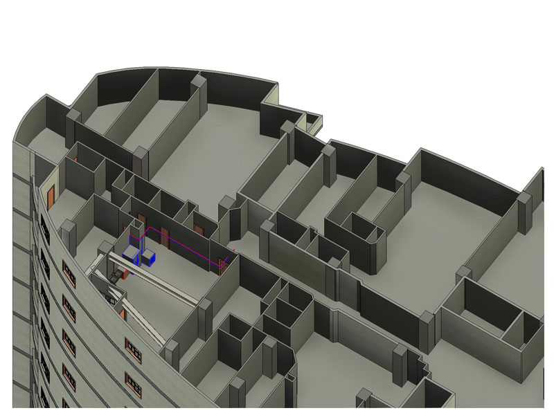 طراحی تاسیسات و مدلسازی آن در نرم افزار رویت به صورت حرفه ای و با استفاده از Fabrication Parts انجام می گردد تا در کنار جلوگیری از تداخلات بتوان لیست متریال دقیق را نیز ارائه داد.